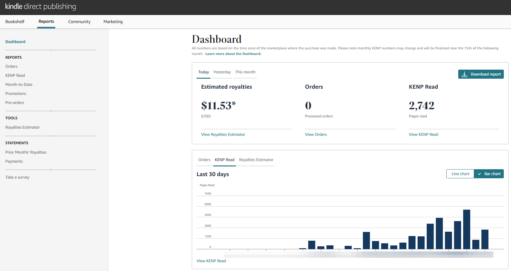 You don't get a ton of details. There's a dashboard for quick overview of current royalties, orders, and page reads. There's some graphs to visualize these things. You can get a more detailed breakdown in some of the subsections including: Orders, KENP Read, Month-to-Date, Promotions, Pre-orders, and the Royalties Estimator. However, you don't get much of a demographic breakdown (country of sale and what version they bought/borrowed). I've honestly been getting a lot more information from my Instagram and Amazon ads than I have from this dashboard.